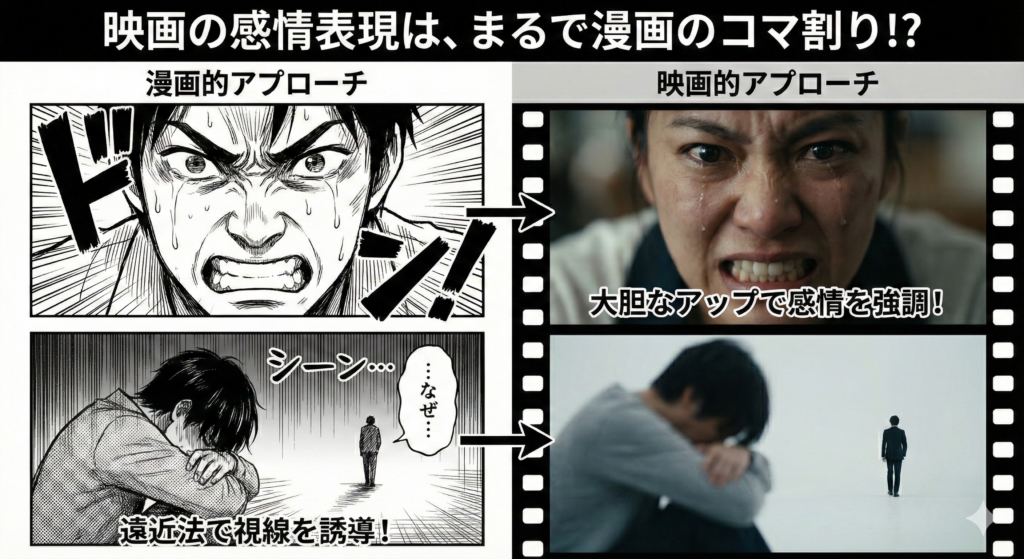 対してアメリカ映画は、登場人物の怒りや悲しみを表現する際、大胆なアップやピントの調整(遠近法)を駆使し、まるで「漫画のコマ割り」のように、今どこを見るべきか、キャラがどう感じているかが直感的に伝わってきました。